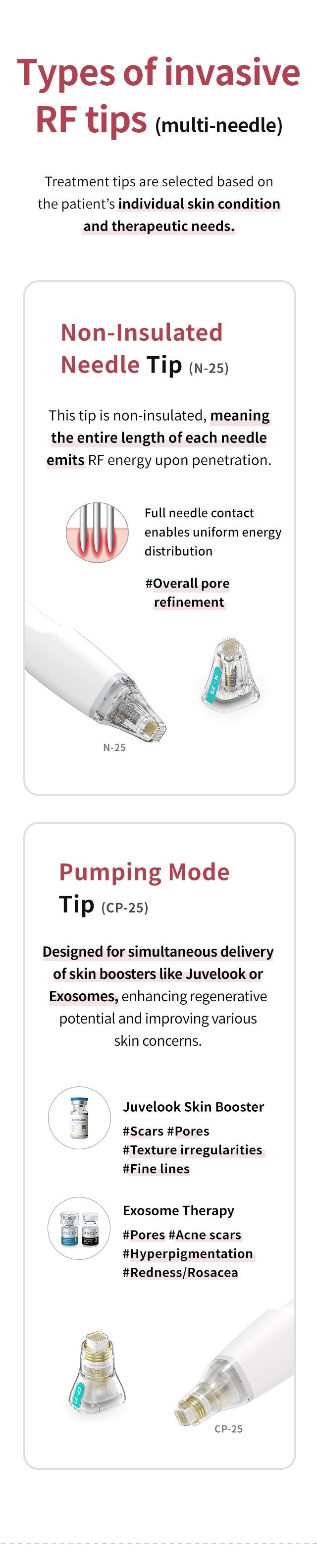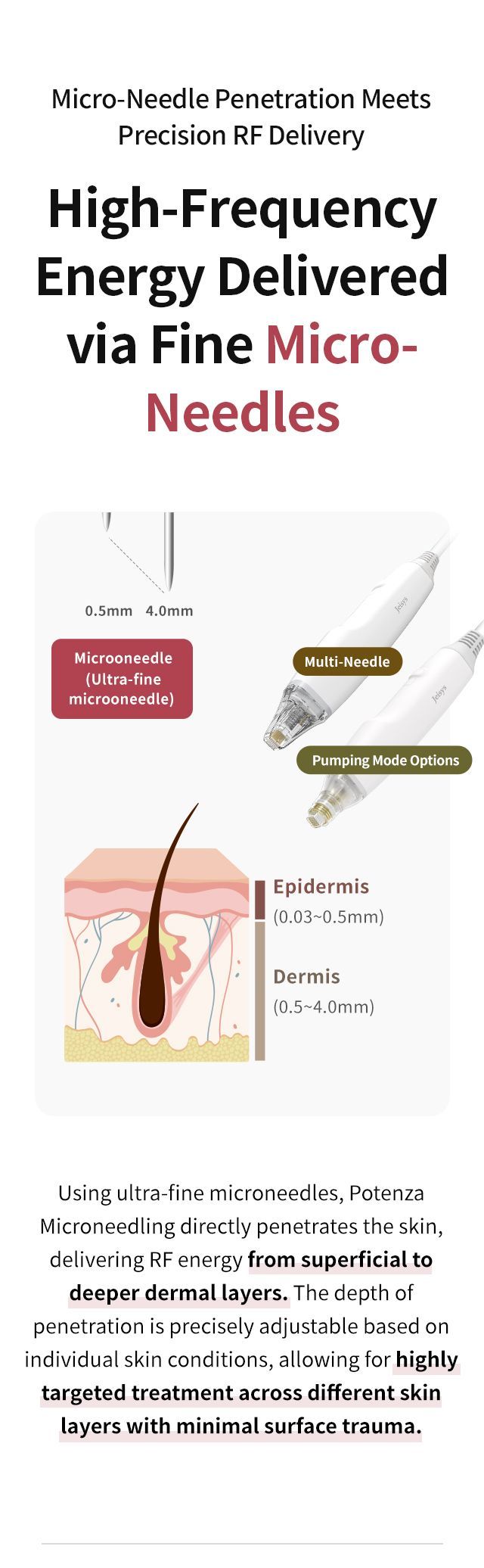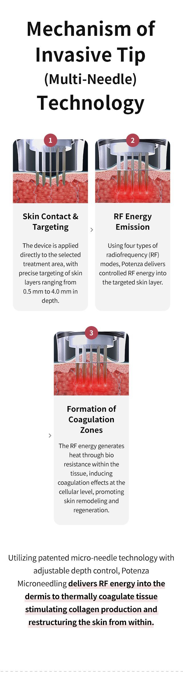 Potenza 使用超细针头在皮肤上制造微通道。射频能量通过这些针头传递,在真皮层产生可控热量。