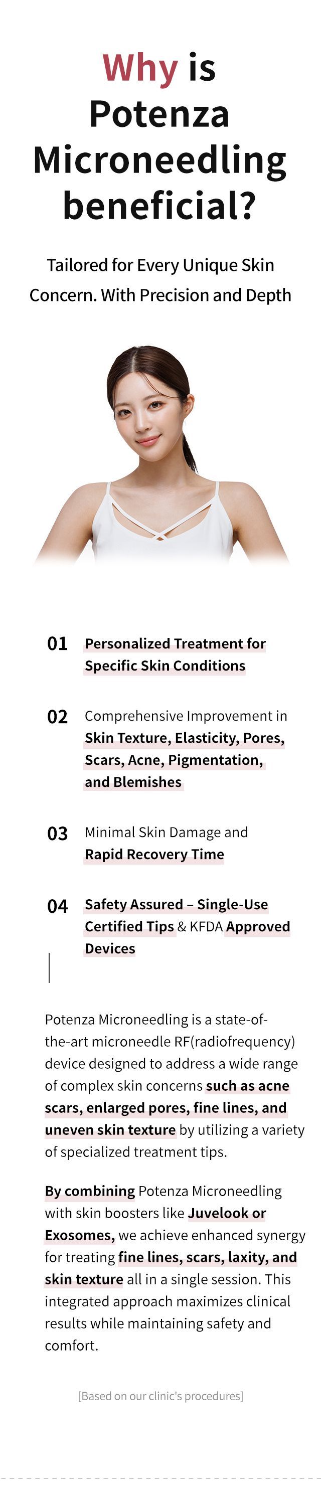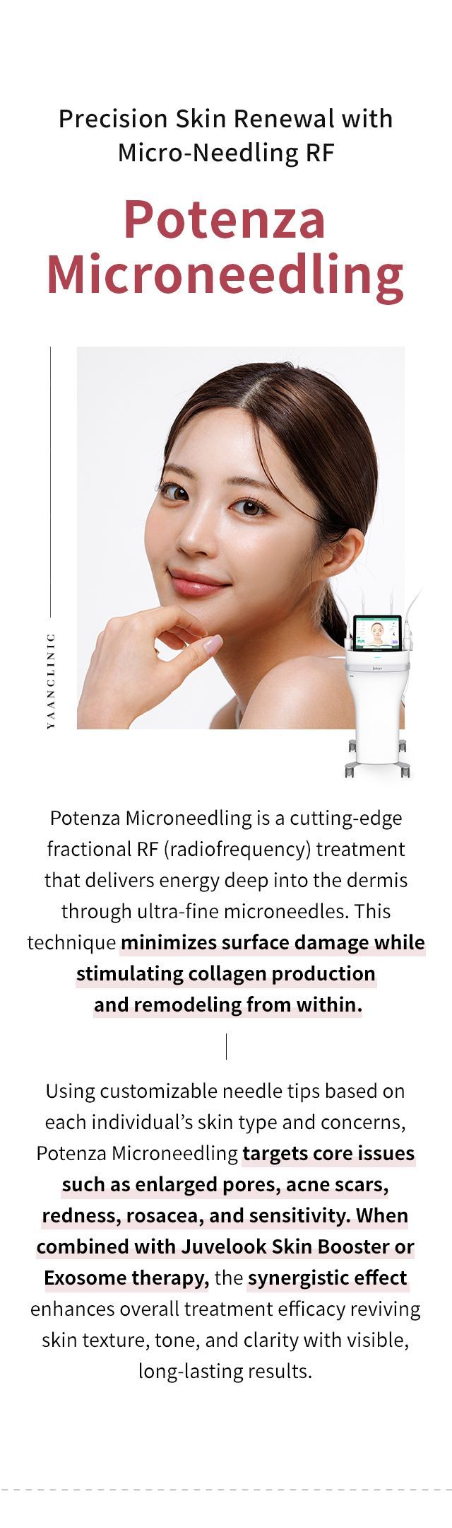 Potenza 是一款先进的射频微针设备,它通过可控的微创伤结合深层射频能量,实现皮肤表面重塑、胶原蛋白紧致和疤痕改善。对于希望拥有紧致肌肤、缩小毛孔、改善肤质、淡化疤痕,且恢复期短、效果显著的患者来说,Potenza 是首尔最受欢迎的疗程之一。